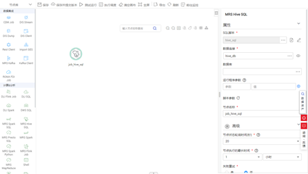 Substep4:进入作业开发页面,拖动Hive SQL节点任务到画布并单击,在右侧的“节点属性”页面配置如下所示。