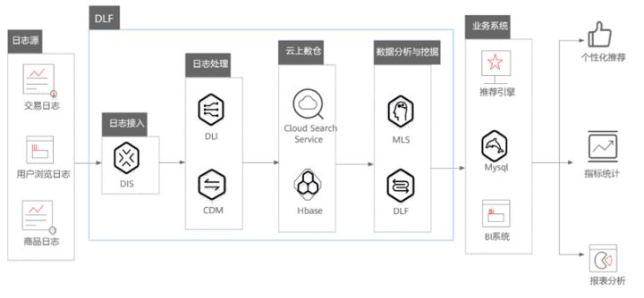 通过DIS将日志数据接入到OBS存储(或者Cloud Search服务),然后通过数据开发模块服务编写数据开发脚本和数据挖掘脚本,实现海量日志分析和挖掘。