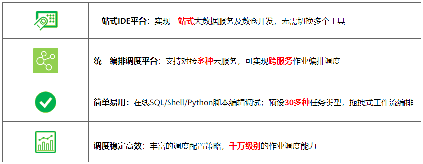 使用数据开发模块,用户可进行脚本开发、作业开发、作业调度、运维监控等操作,轻松完成整个数据的处理分析流程。