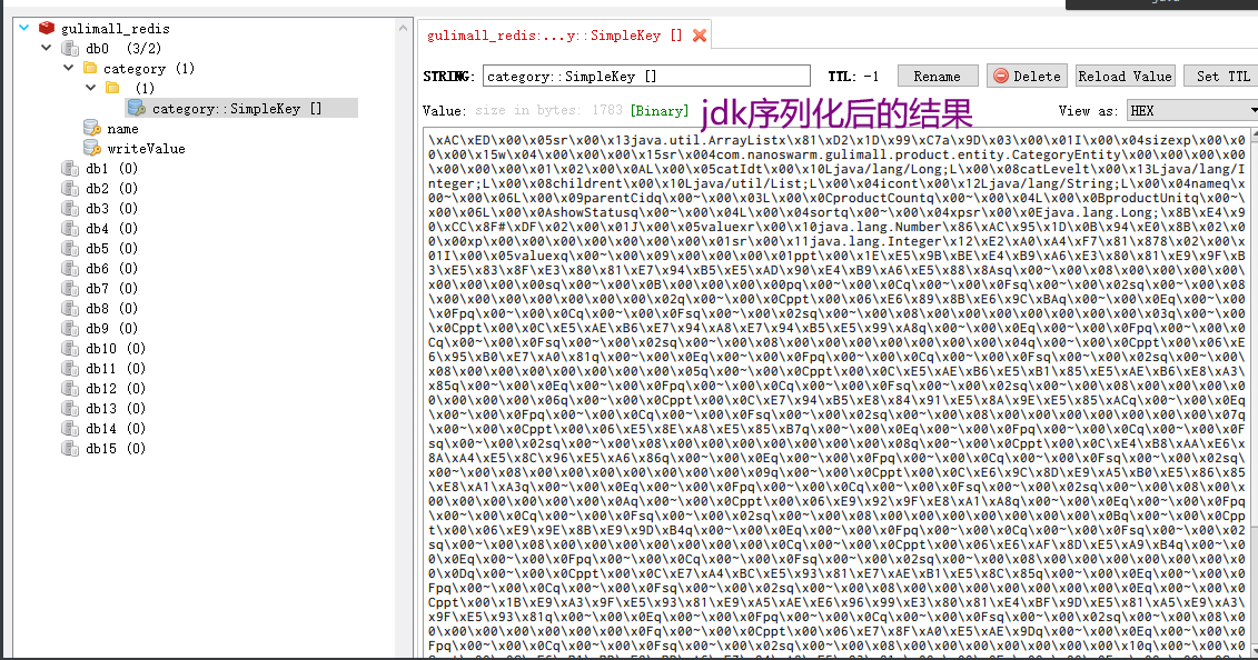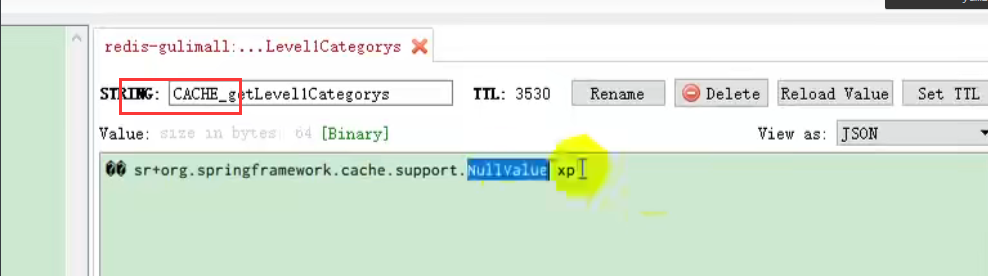 //查到的数据再放入缓存,将对象转为json放在缓存中 String s = JSON.toJSONString(catalogJsonFromDb); redisTemplate.opsForValue().set("catalogJSON", s,1, TimeUnit.DAYS);