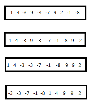如上图,第一次找到第一个黑框里的负数集合{-1,-8}和正数集合{9,2},进行替换得到第二个黑框。然后找到第二个黑框里的负数集合{-3,-7,-1,-8}和正数集合{9}。以此类推。只需要遍历一遍,但是替换时候重复替换,时间复杂度OlogN,空间复杂度O(1),并且保持相对位置。