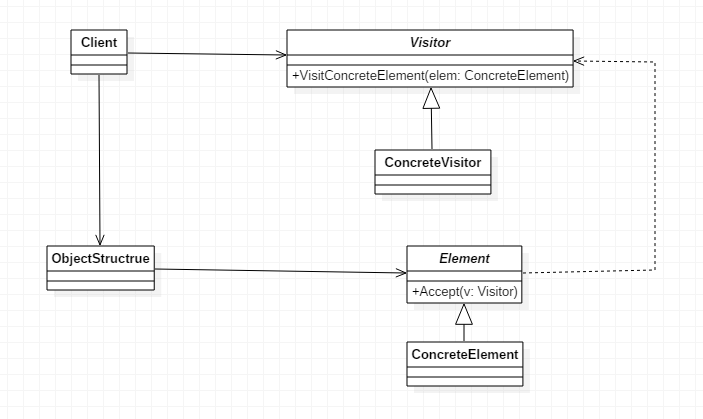 其中,Visitor是抽象访问者,为该对象结构中ConcreteElement的每一个类声明一个Visit操作;ConcreteVisitor是具体访问者,实现每个由visitor声明的操作,是每个操作实现算法的一部分,而该算法片段是对应于结构中对象的类;ObjectStructure为能枚举它的元素,可以提供一个高层的接口以允许访问者访问它的元素;Element定义了一个Accept操作,它以一个访问者为参数;ConcreteElement为具体元素,实现Accept操作。