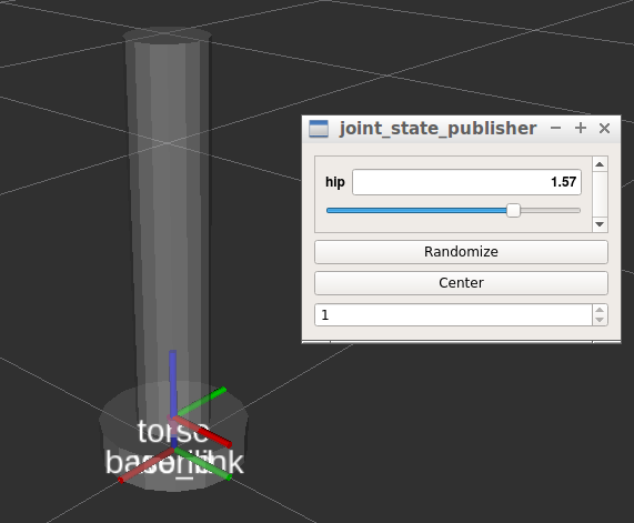 注意:hip 是一个 continuous 类型关节,子杆件 torso 可以相对父杆件 base_link 绕 z(blue axis)任意旋转。可以使用 joint state publisher GUI 来设置该 URDF。