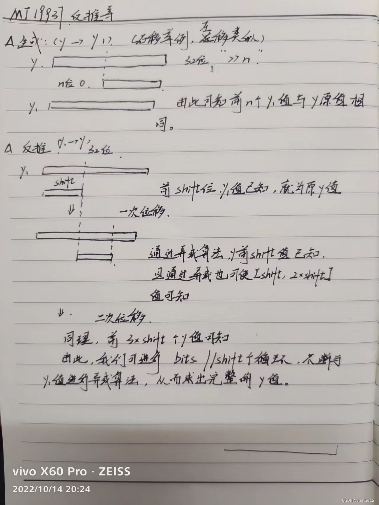 反推导就是我们在知道通过Mt19937算法求得的y1,来反推出用于MT19937算法的state原始值y。而异或的反推则是再异或相同的数就可以消去这个相同的数。