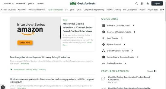 对于“算法和数据结构”主题,GeeksforGeeks 有很多很好的文章、解释和代码解决方案。在这里,你可以: