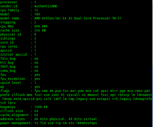 我的processor有两个不同的编号,并且同属于一个physical id,同时cpu cores 的值为2,这也就说明了我的CPU是双核心的,并且每个核心只有一个逻辑处理器。