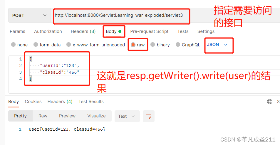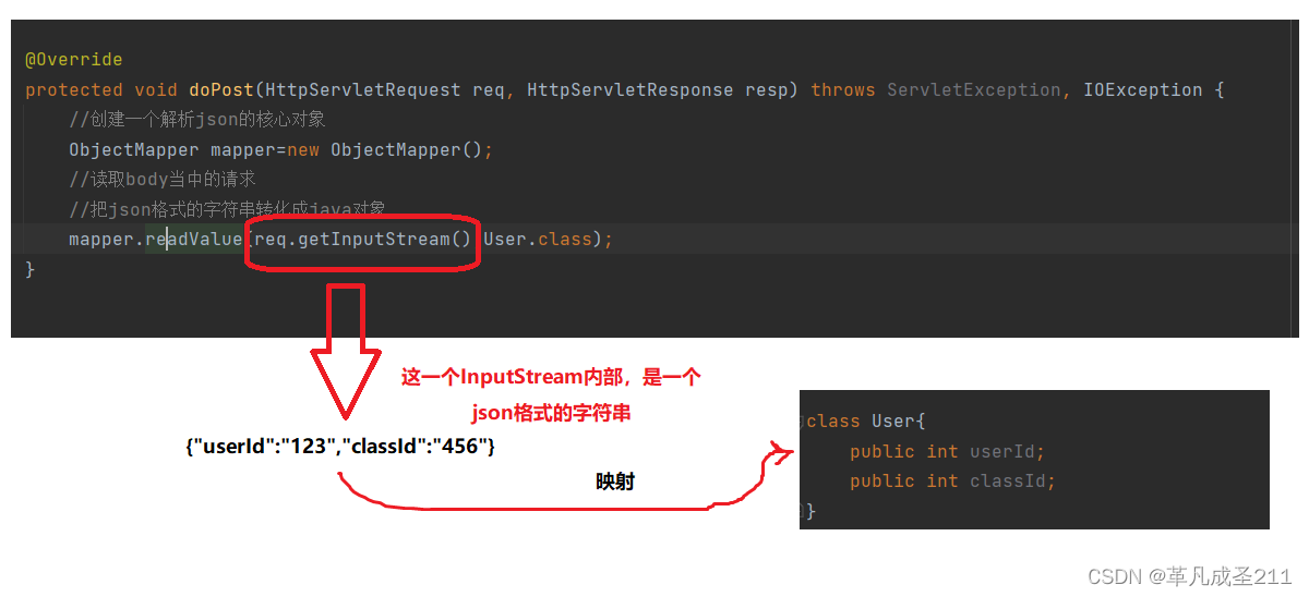/ * @author 25043 */ @WebServlet("/servlet3") public class Servlet3 extends HttpServlet { @Override protected void doPost(HttpServletRequest req, HttpServletResponse resp) throws ServletException, IOException { //创建一个解析json的核心对象 ObjectMapper mapper=new ObjectMapper(); //读取body当中的请求 //把json格式的字符串转化成java对象 User user= mapper.readValue(req.getInputStream(),User.class); //把user返回给前端 System.out.println(user); resp.getWriter().write(user.toString()); } }