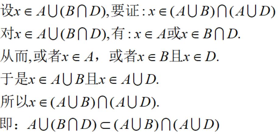 这三条定律都是可以证明的,我们选择分配律的第二条来证明。要证明两个集合相等,只需要证明互为子集。分两步走。