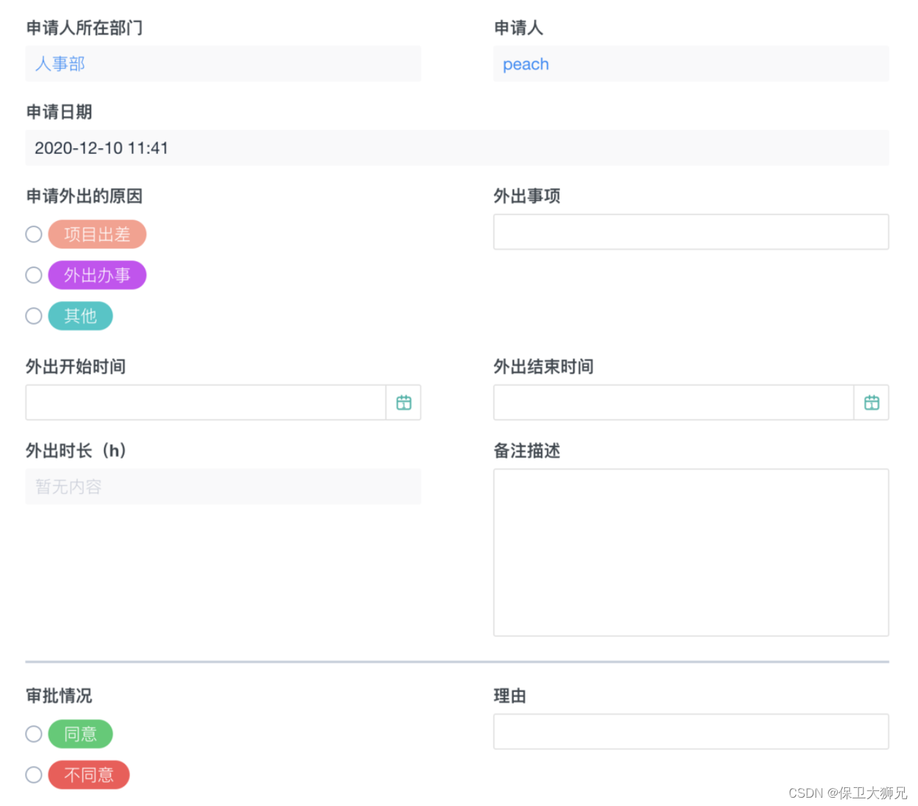 请假申请为 流程表单,由请假申请、直接部门审批、部门主管审批组成