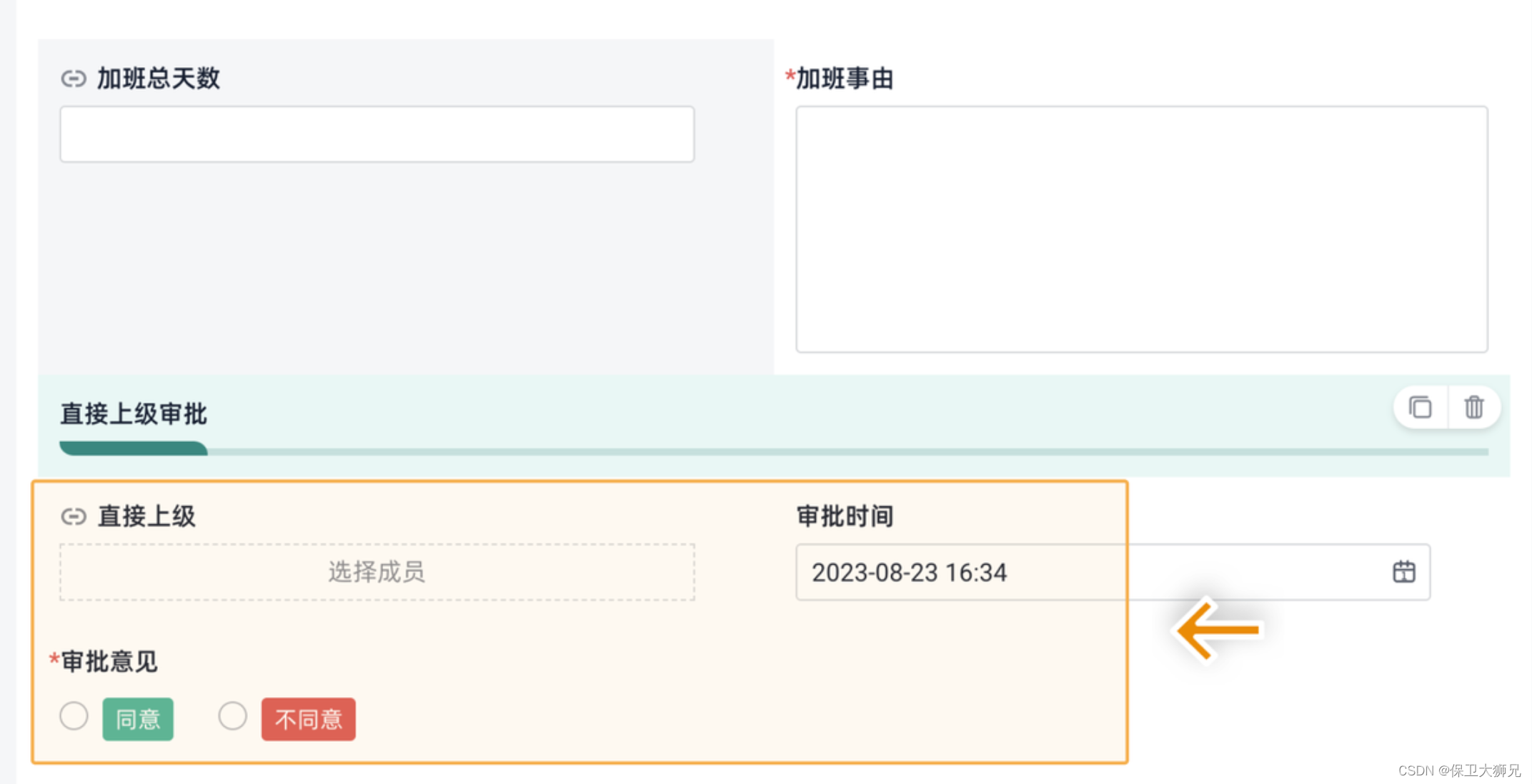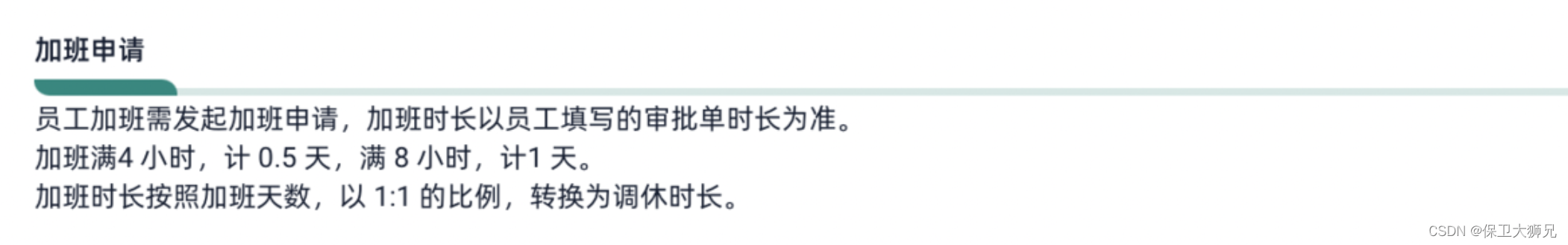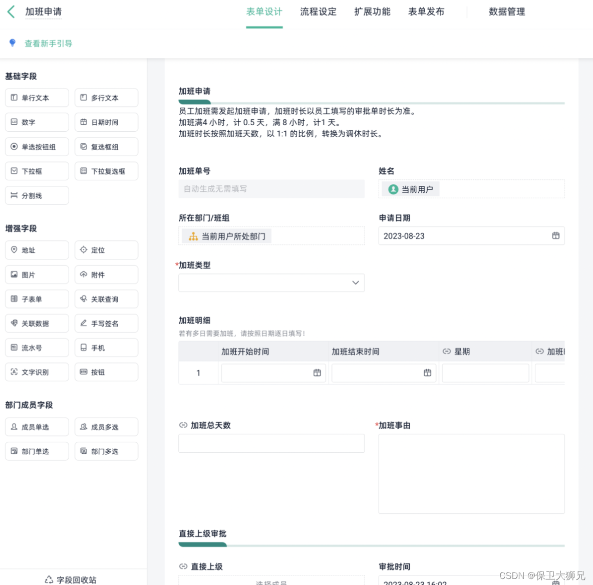 在设计表单之前,需要确认企业的加班规则。比如,加班时长可以用于兑换 调休。