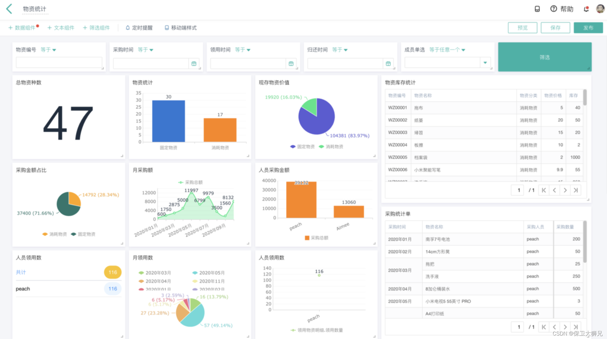 通过仪表盘可以对整个物资管理进行统计分析与展示,随时查看物资动向。