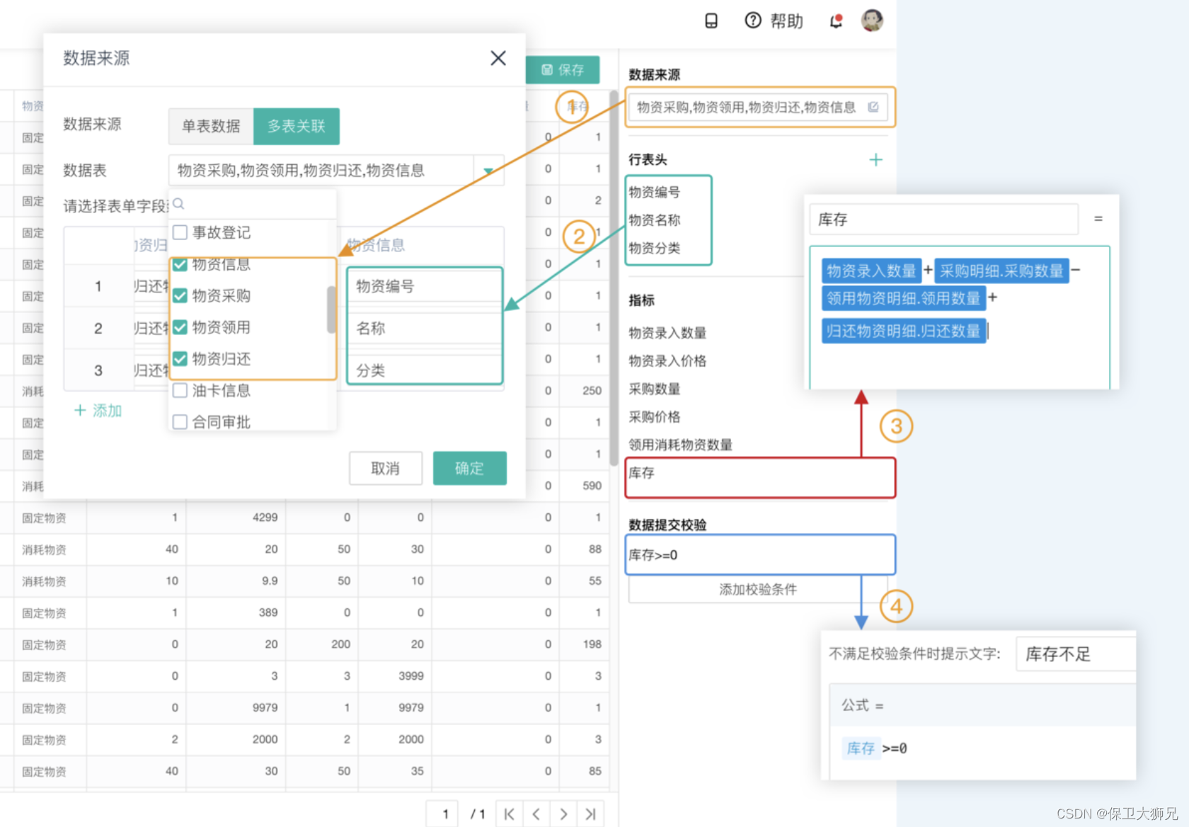 - ①数据来源:分别是物资信息、物资采购、物资领用、物资归还这4张表单中的数据。