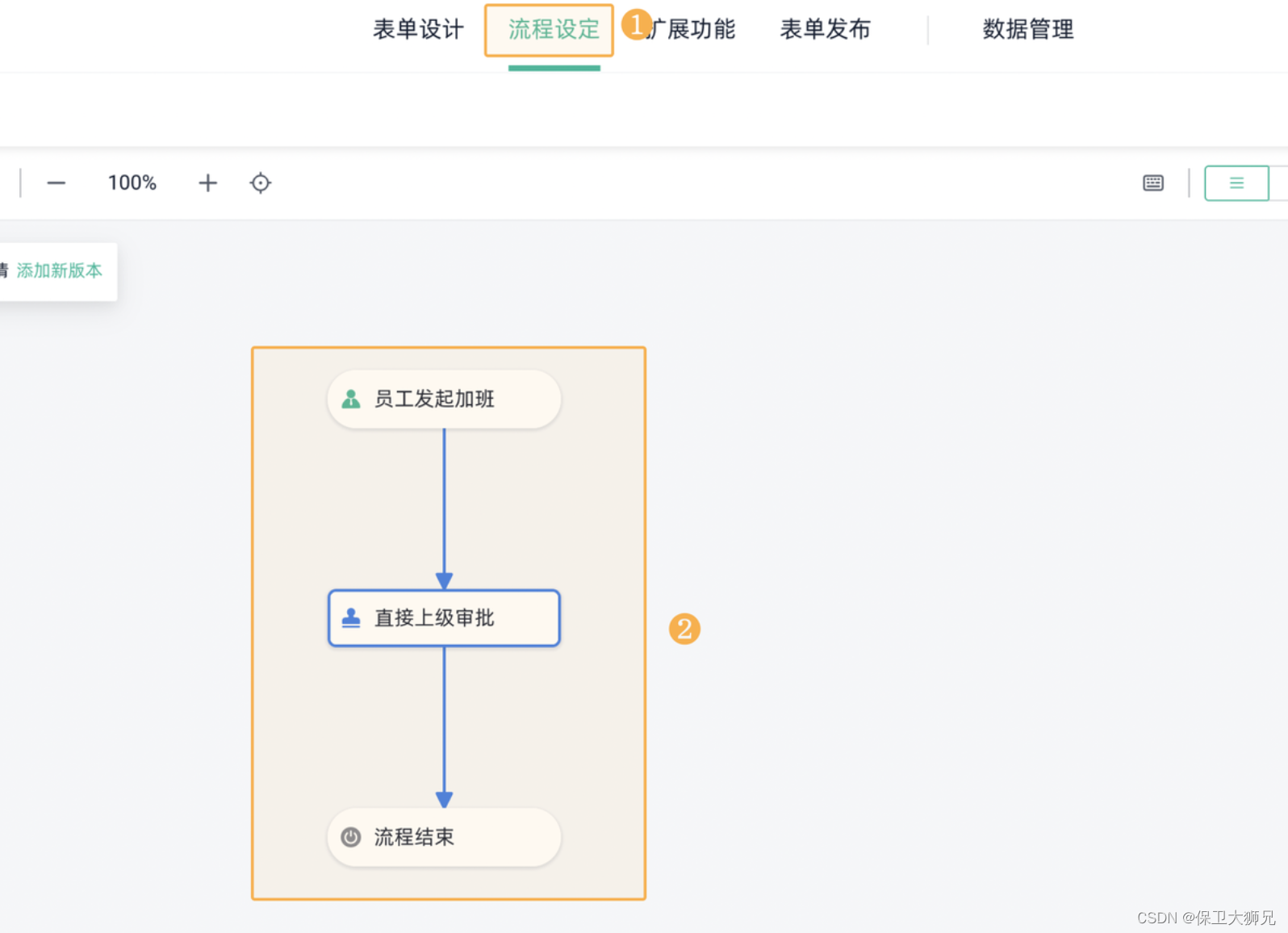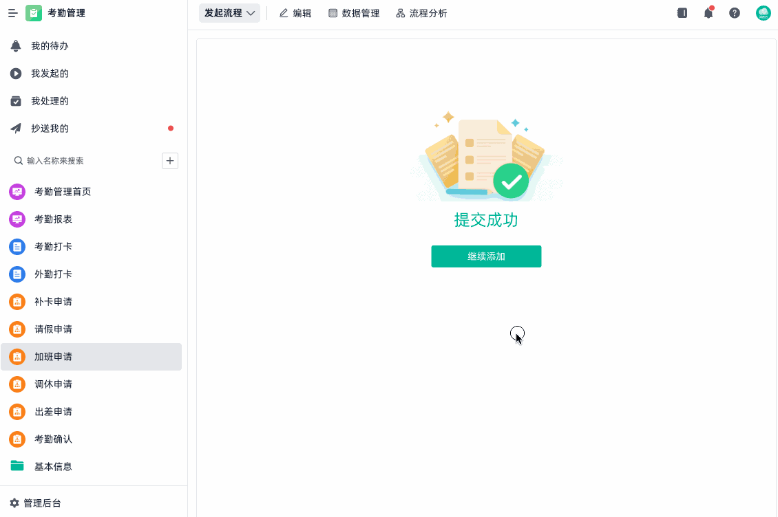 加班申请流程比较简单,员工提交加班申请后,由直接上级审批即可完成加班流程的流转: