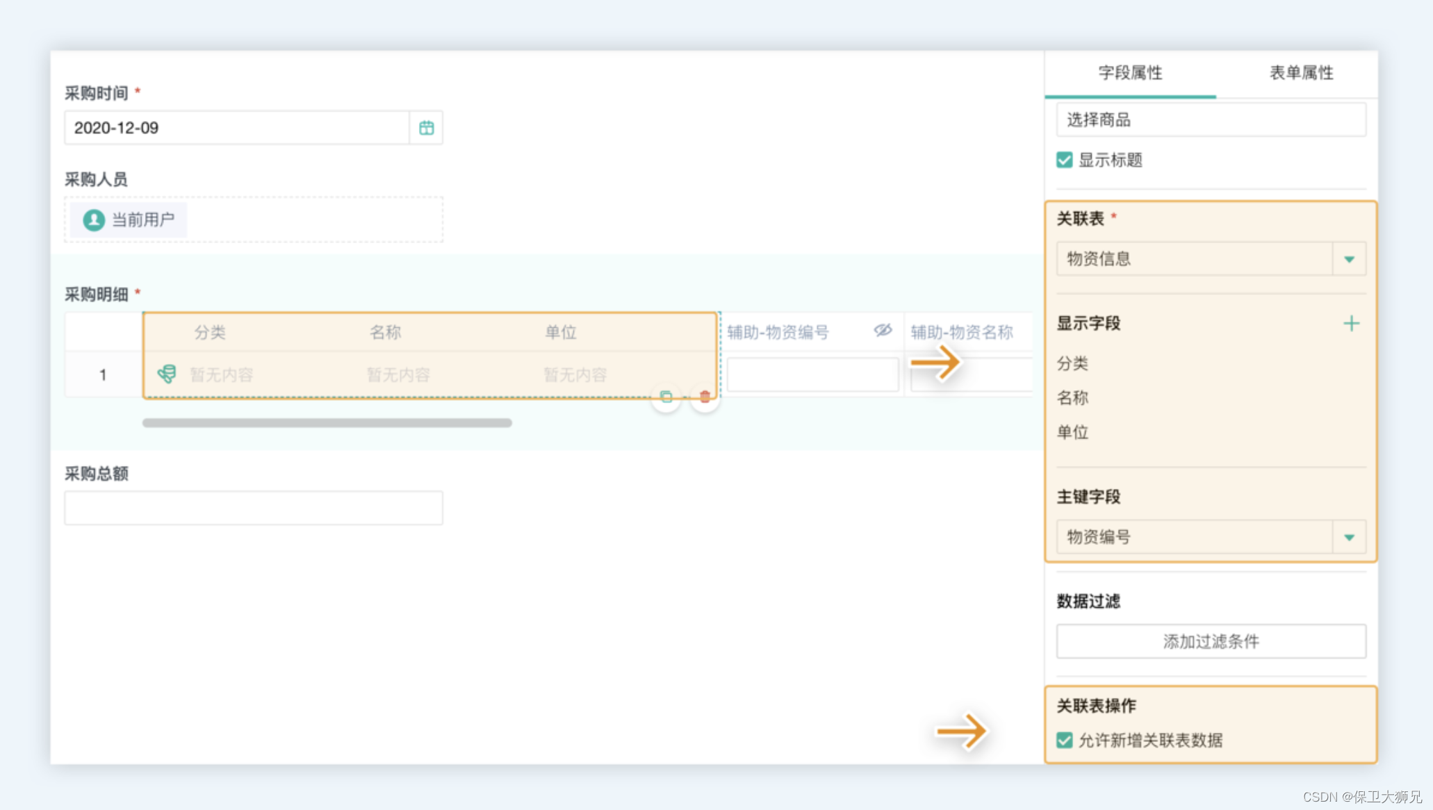 - ②行表头:由这4张表单多表关联的字段组成,分别是各表单中的物资编号、物资名称及物资分类。