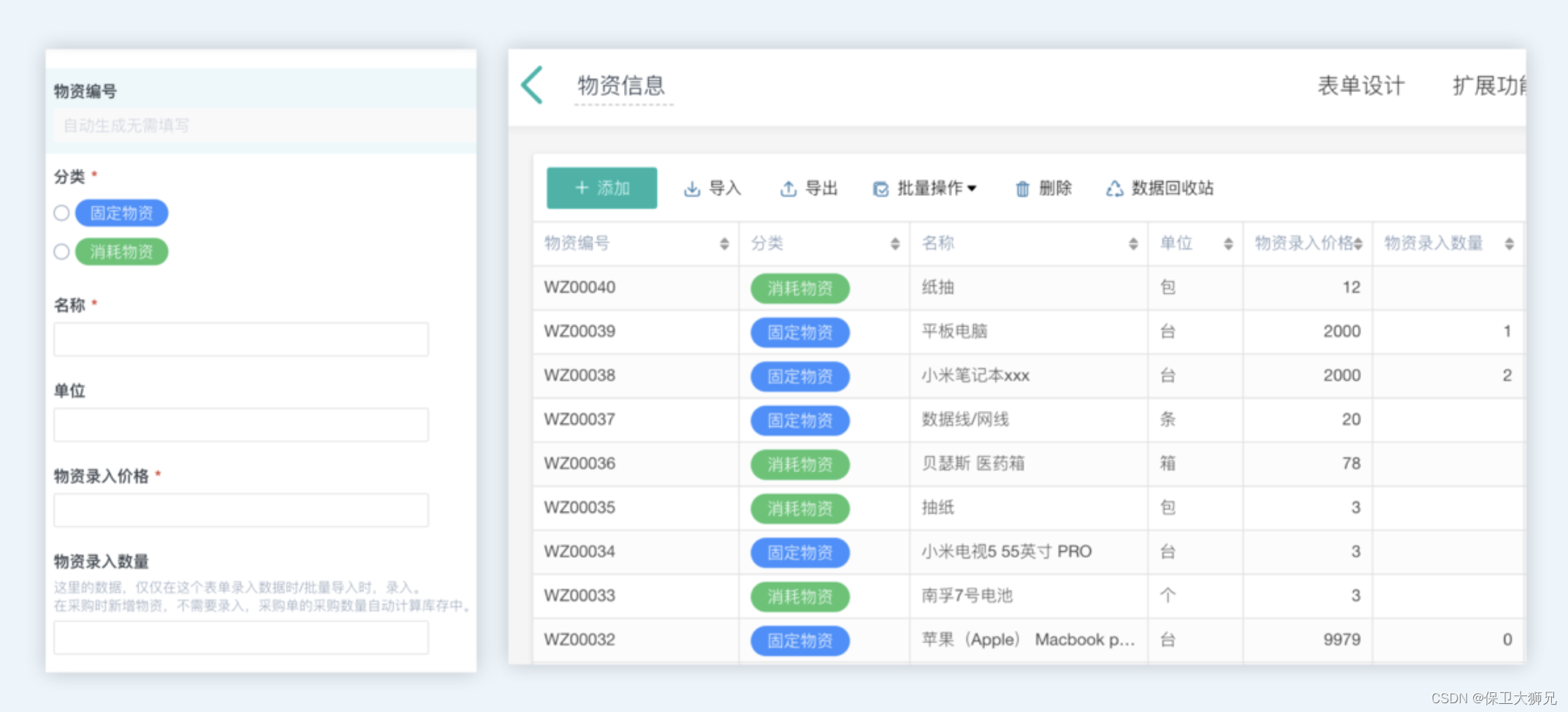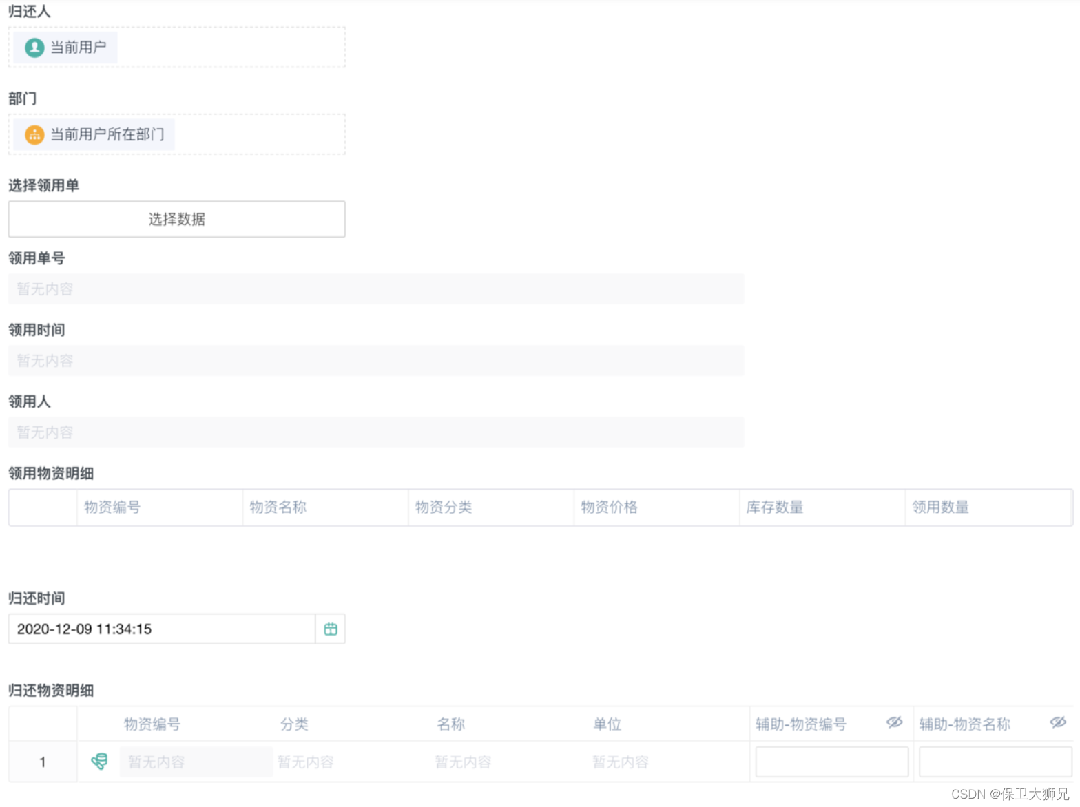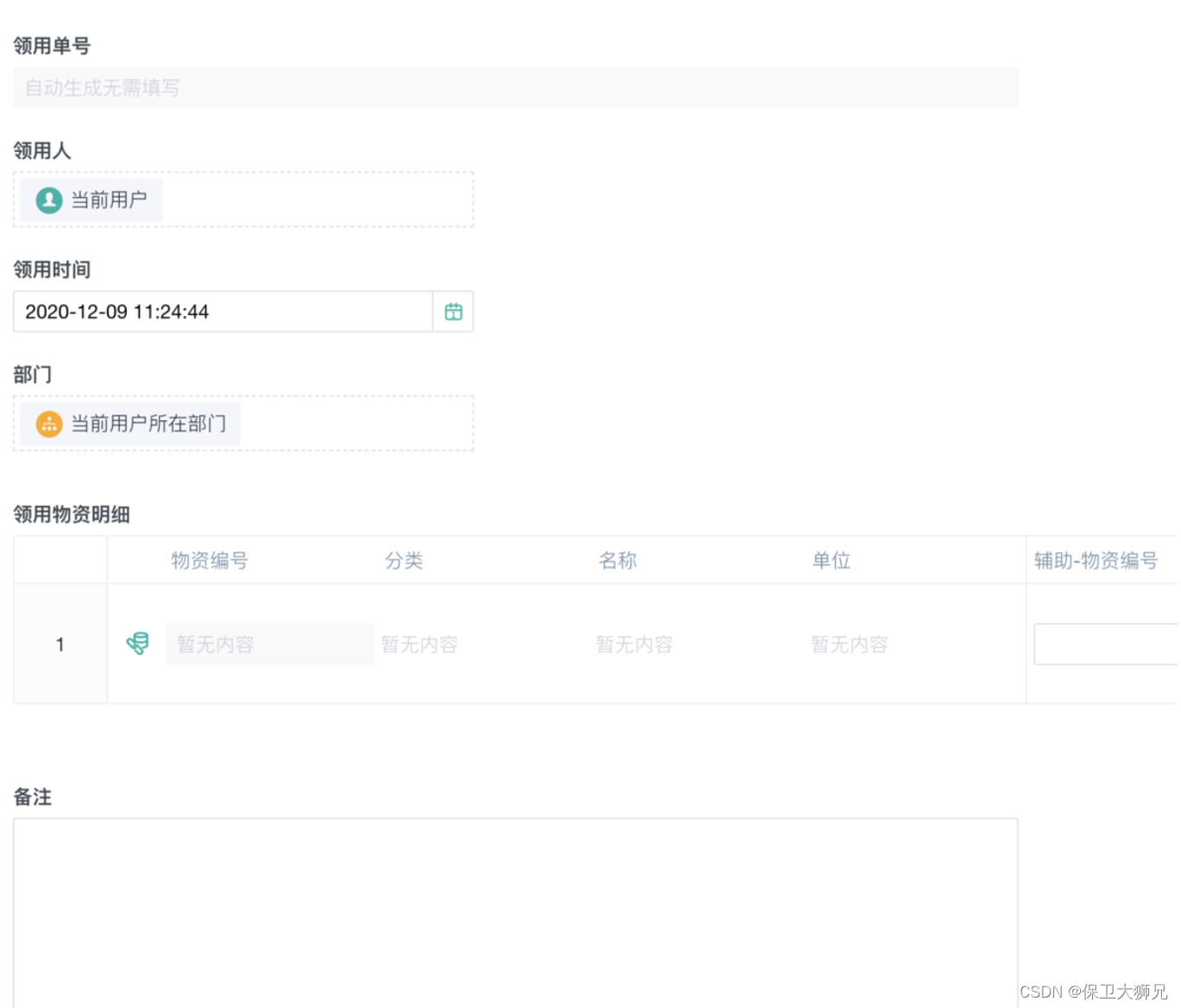 物资领用与物资采购的表单设计类似,主要记录领用数量,方便库存精准计算