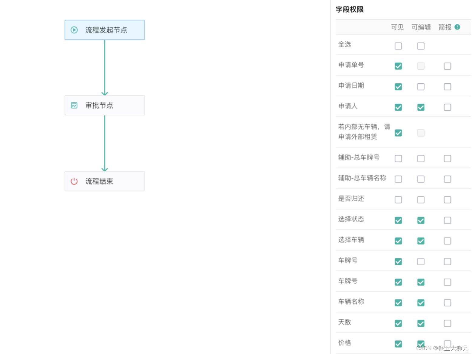 流程中,需要为每个流程节点设置节点审批人及每个字段的可见可编辑权限。