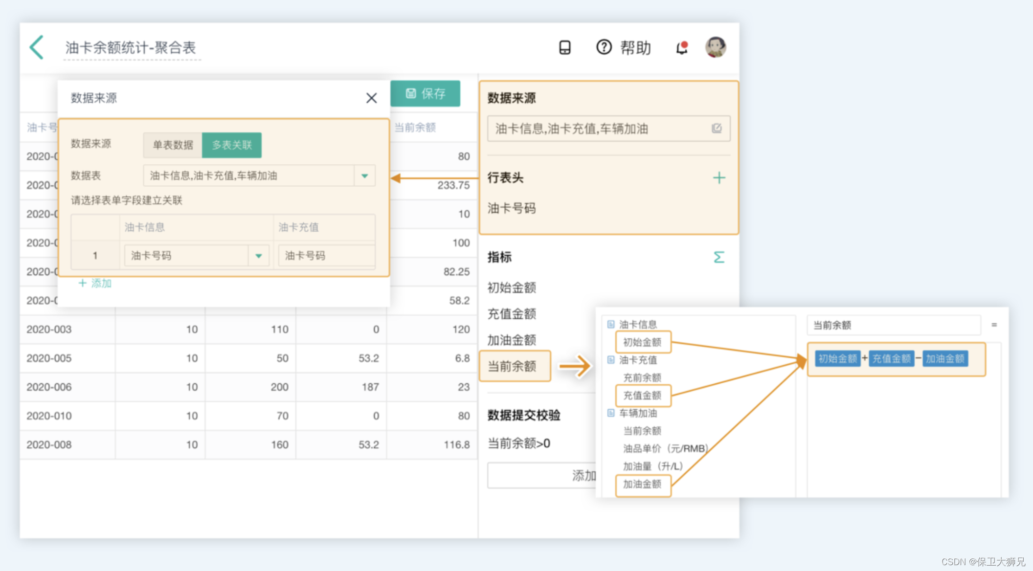 在油卡使用的过程中,会有一个油卡「当前余额」的计算,这里需要用到聚合表计算,后文 [4.2.2] 详细讲解。