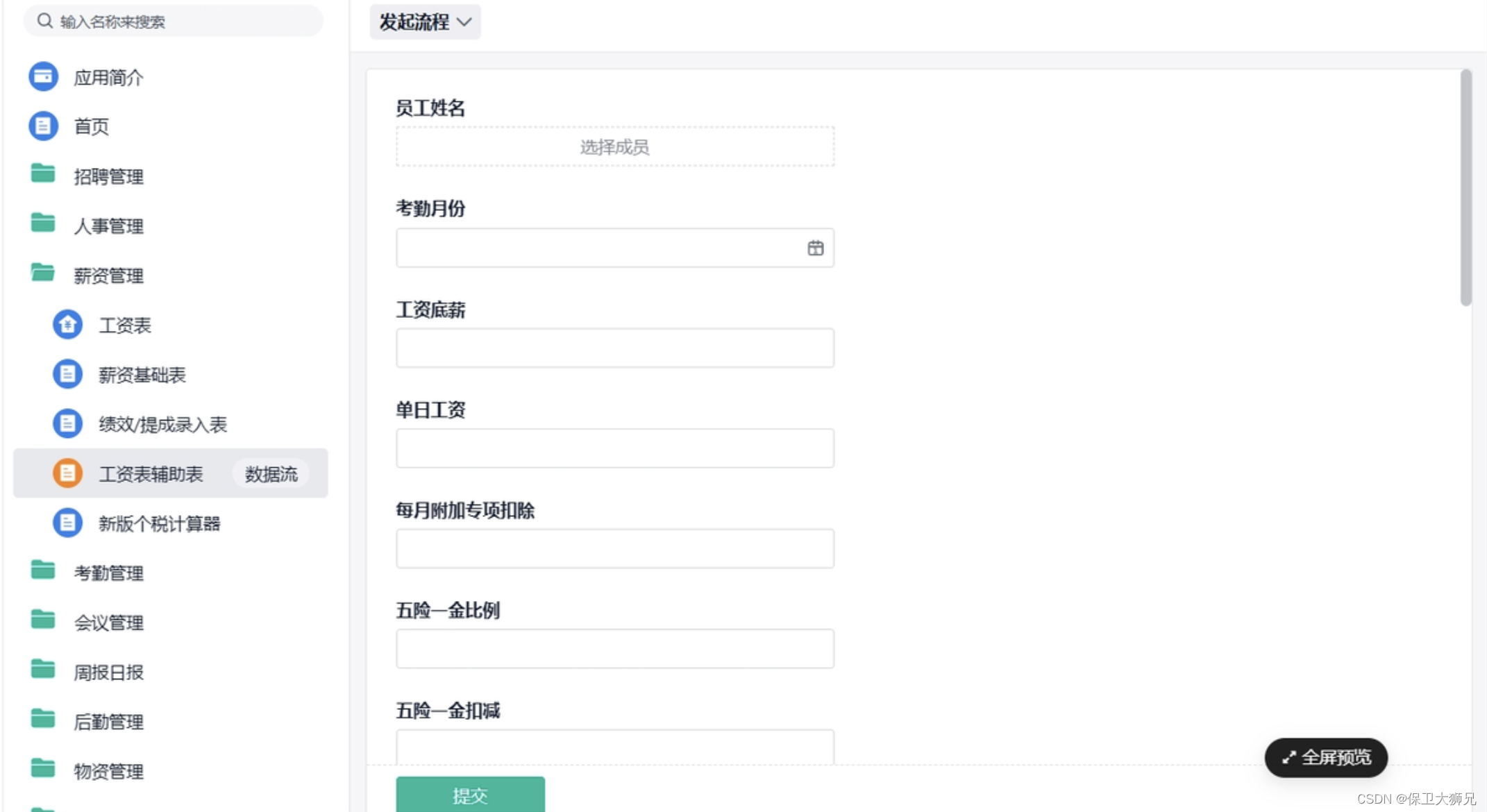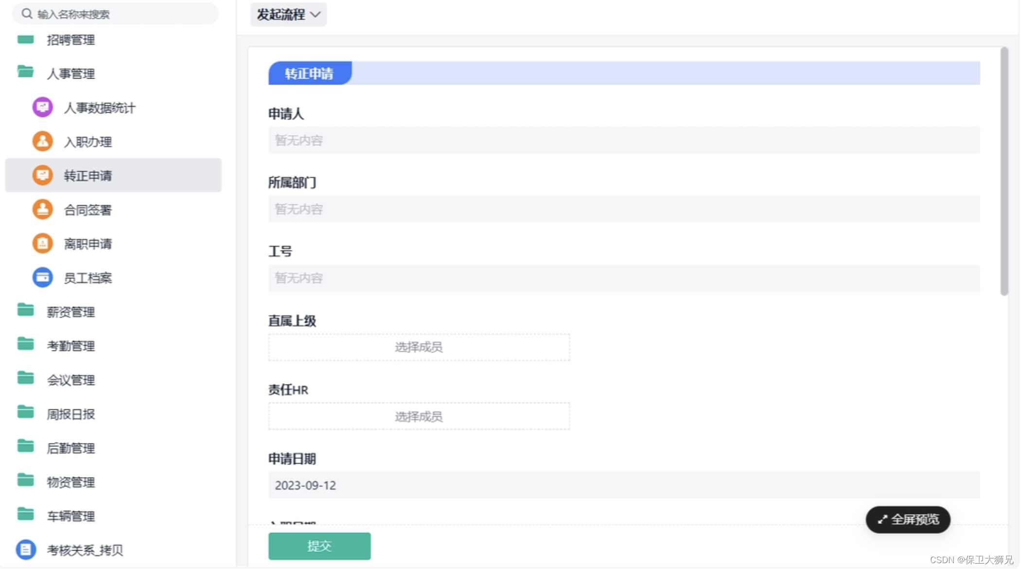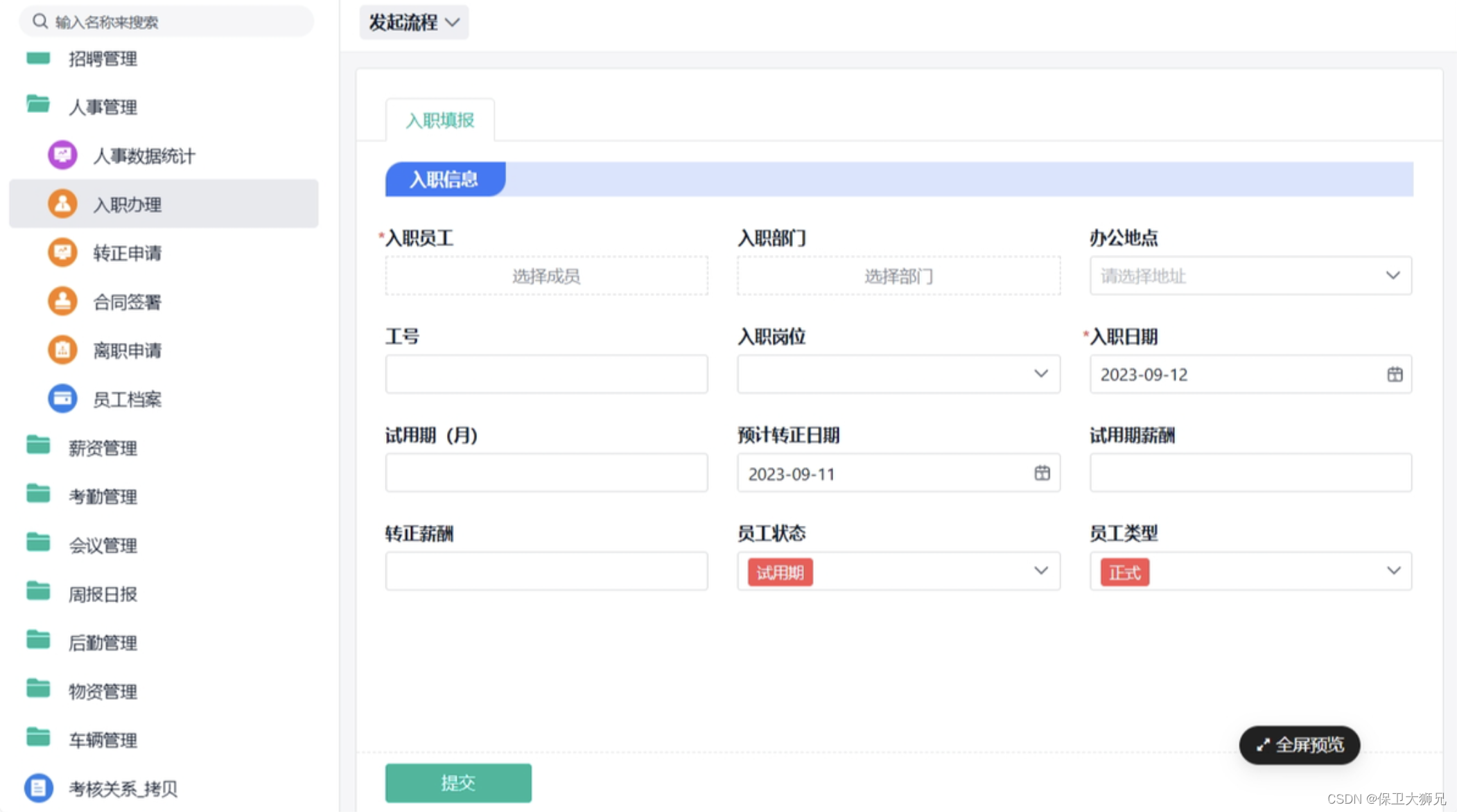 通过流程表单来实现人员的流动,员工发起入职办理或离职申请,由部门主管审批。