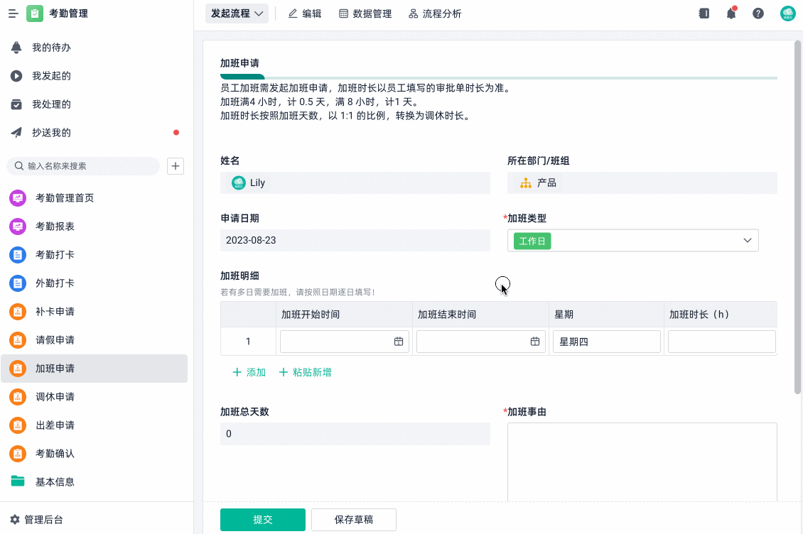 加班明细使用子表单,可以录入多条加班数据,根据加班时间计算出对应的加班时长: