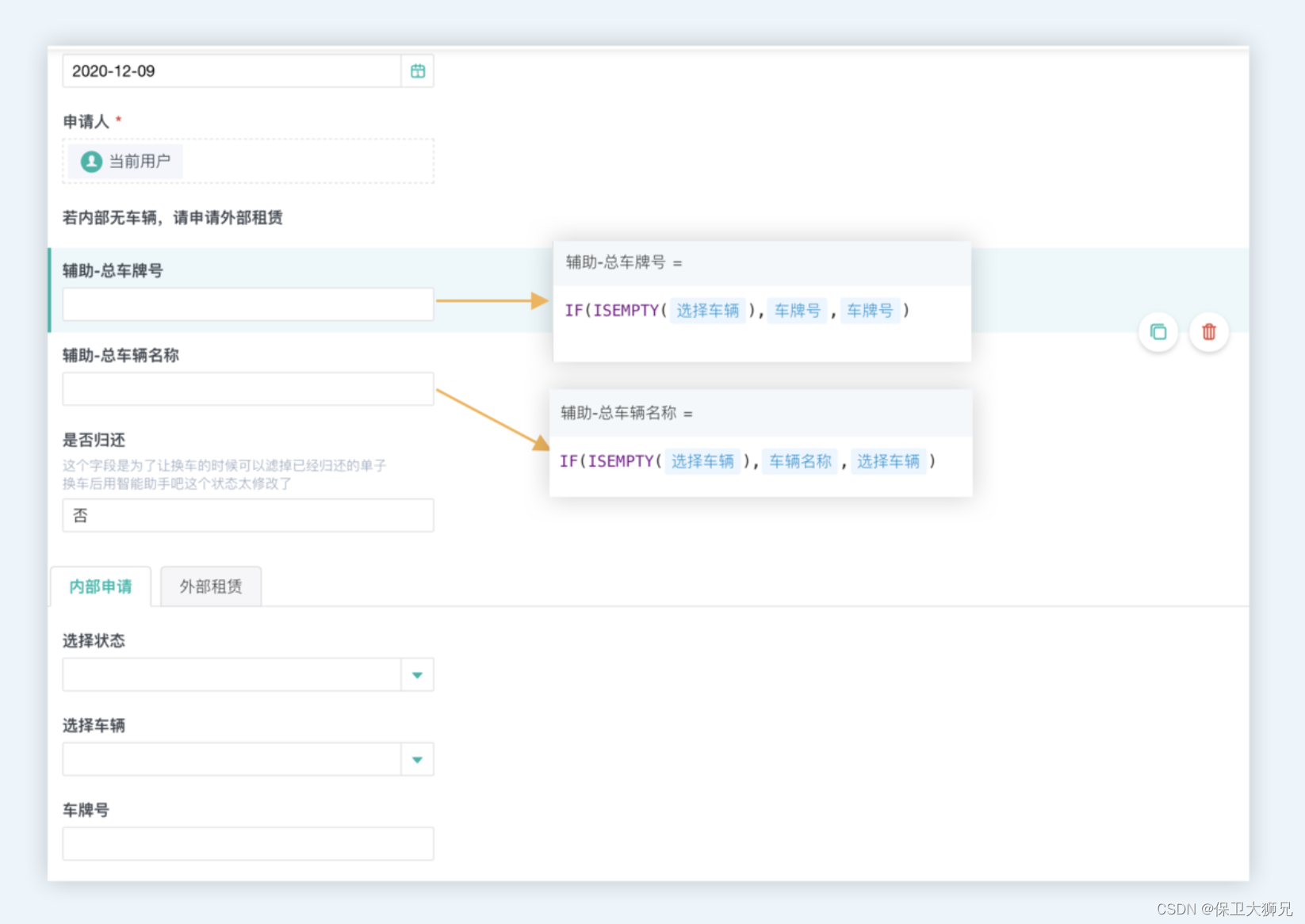 汽车申请流程表中主要难点在于两个公式的设置,通过判断是否内部申请还是外部申请,来确定最终申请的车牌号和车辆名称。对这两个辅助字段需要设置为不可见(流程节点处设置),同时,「表单属性」的「不可见字段赋值」需要设置为「始终重新计算」。