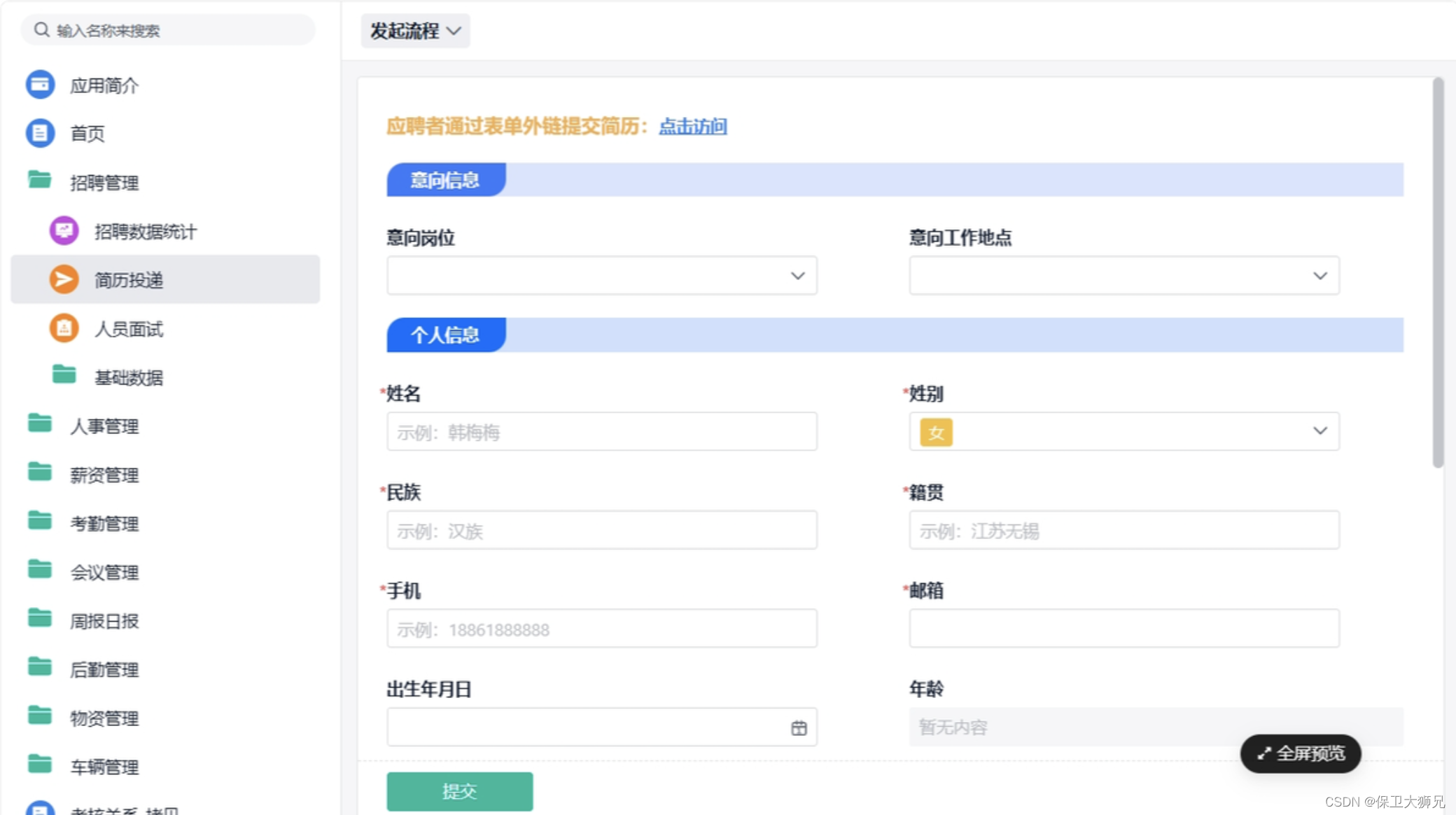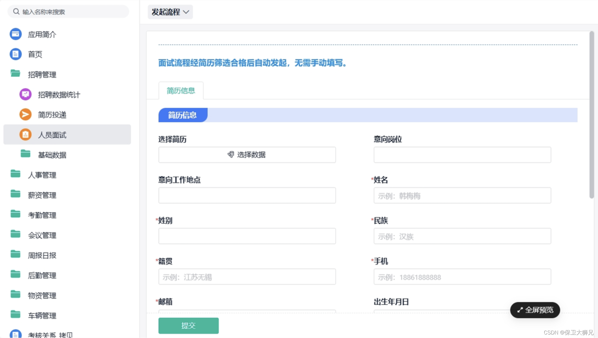 面试流程经简历筛选合格后自动发起,无需手动填写。