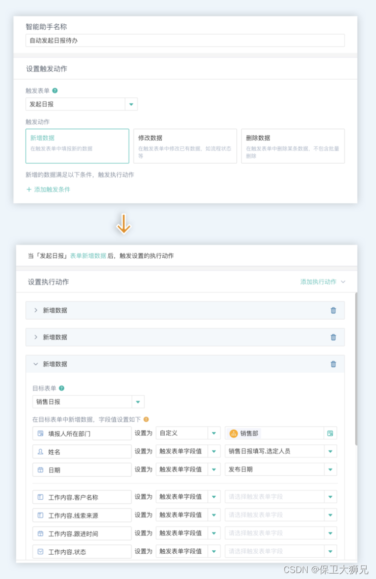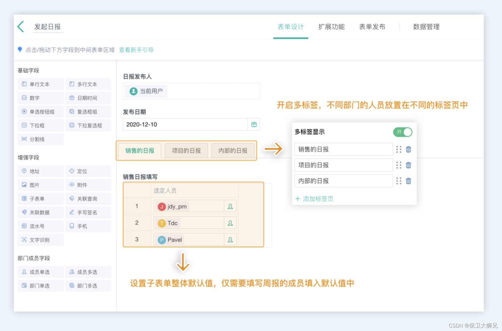 固定的人员每天定时发起日报,发起后将分别在项目日报、内部日报、销售日报等部门日报提交表中为每个成员自动发起日报提交流程。