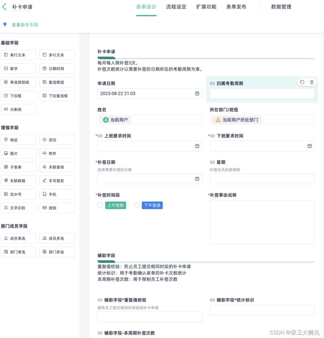 补卡申请表由补卡申请、辅助字段以及直接上级审批意见组成: