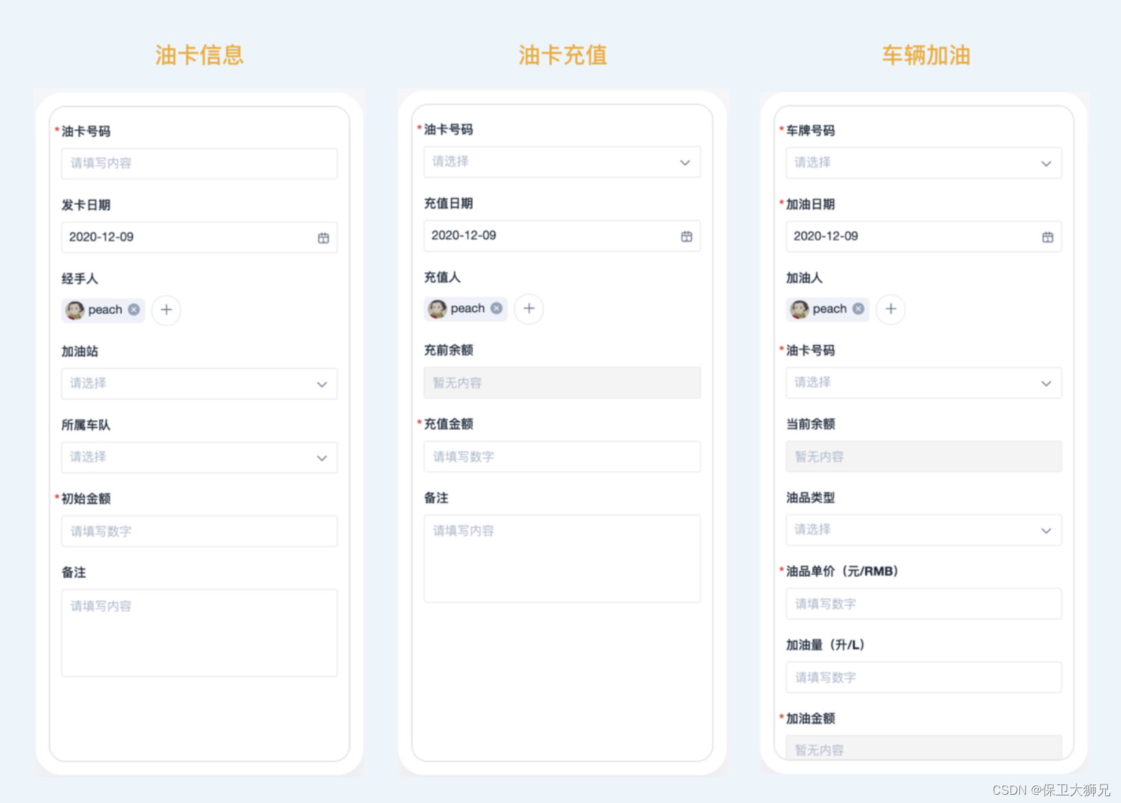 - 油卡信息:建立油卡基础信息,用于车辆加油;