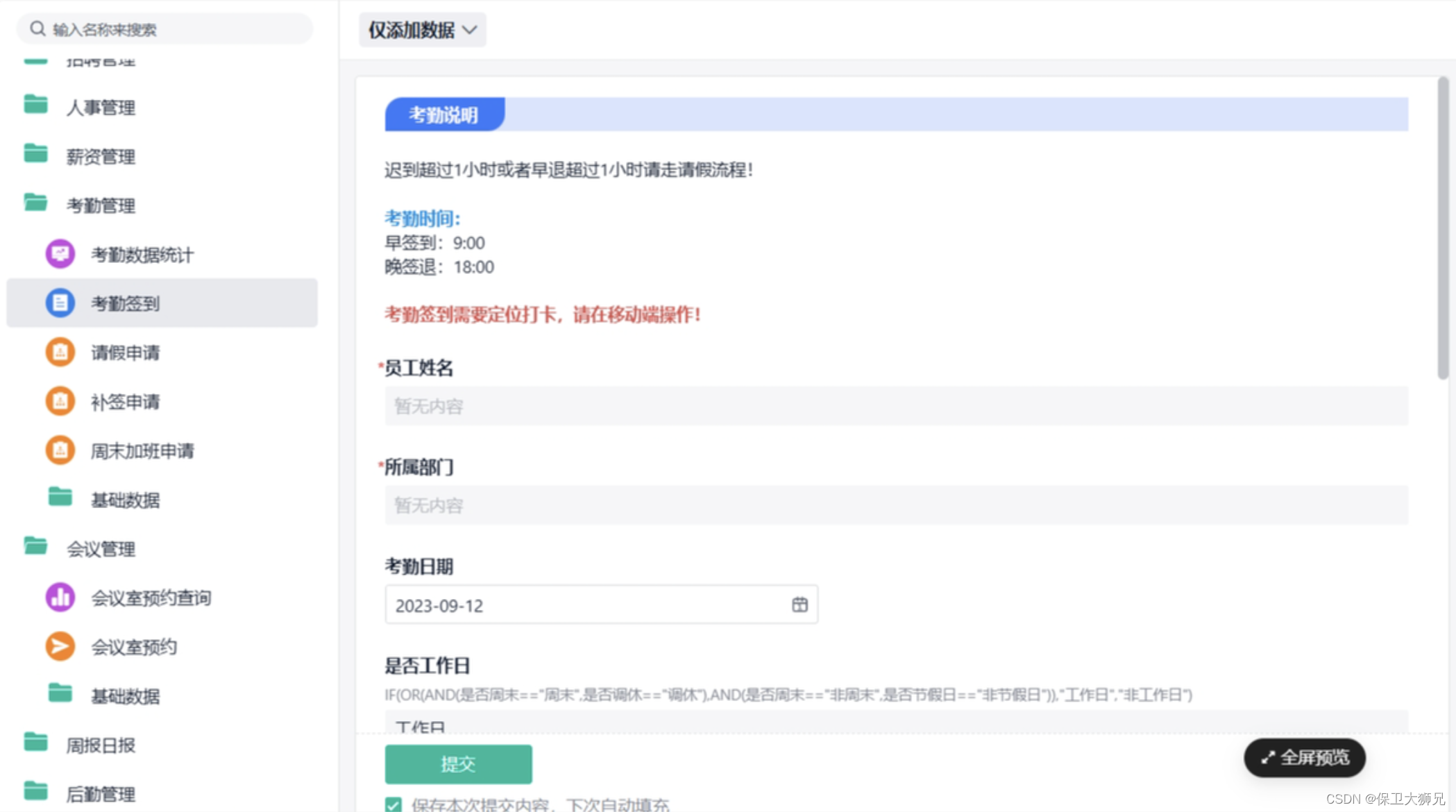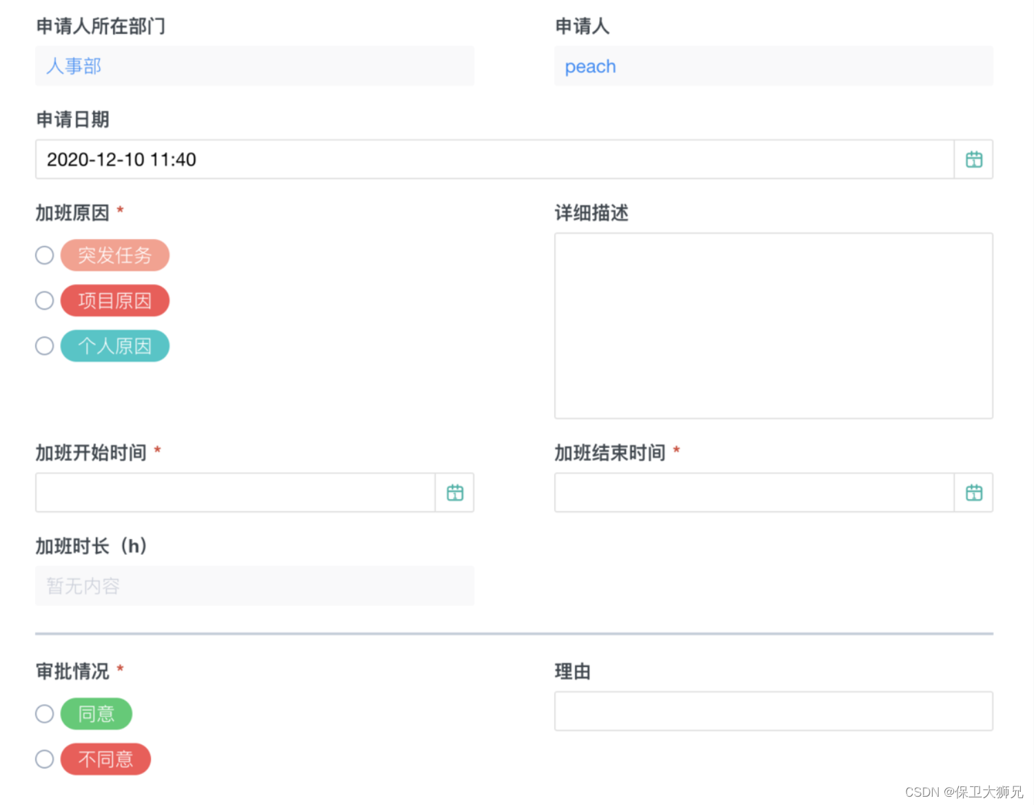 注意:在设计这几个表单的时候,需要明确公司的规则,比如以周末加班申请为例