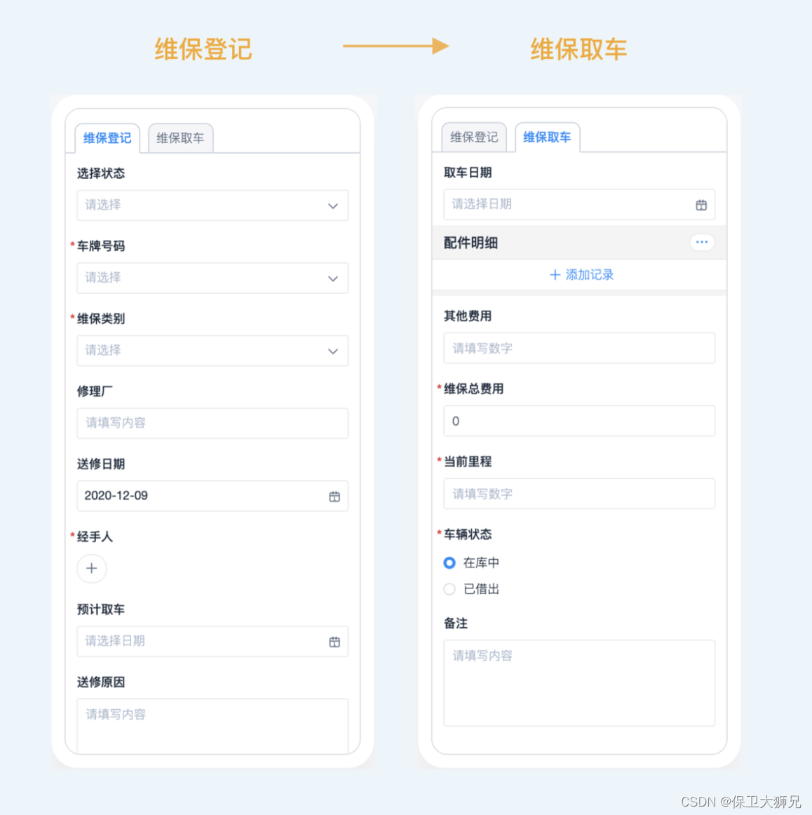 - 维保登记:提交维保登记记录,将车辆送去4s店或者维保地点进行维修/保养。
