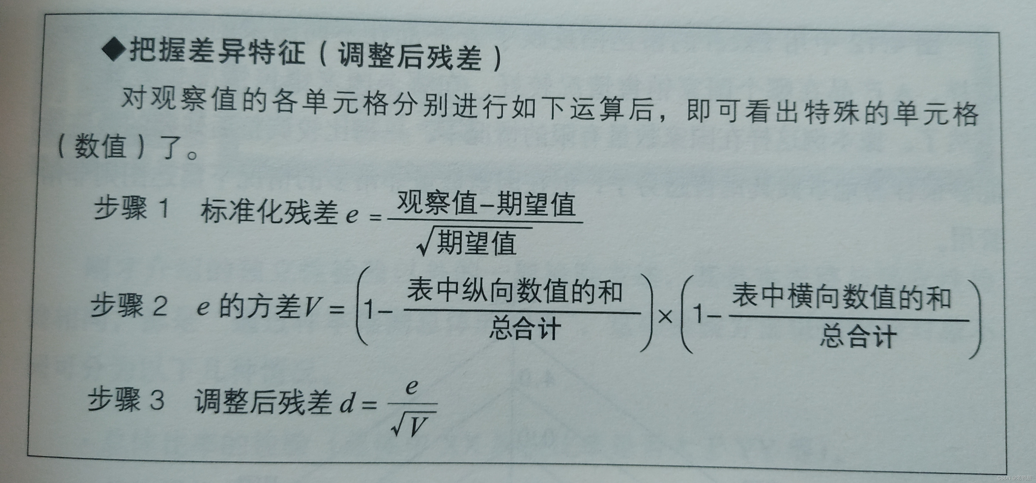 (5)利用独立性检验只能检验“能否确定存在差异性的问题”。即使结果显示其数据确实存在差异性,但是从该结果上并不能得知哪个因素存在多大的差异,是正向差异还是负向差异,接下来就需要用到“调整后残差”的概念了。