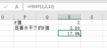 下面用完全相反的方法来解决上述事例,利用另一个与F分布相关的excel函数,它的计算方法与finv函数相反,被称为fdist函数。