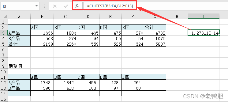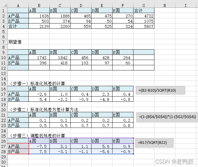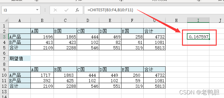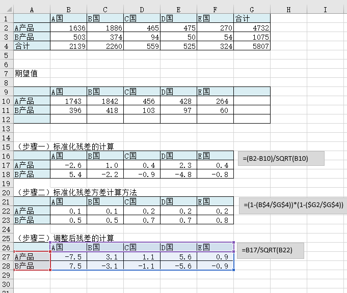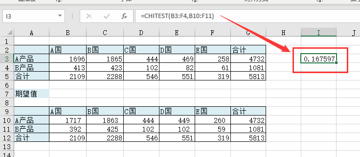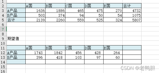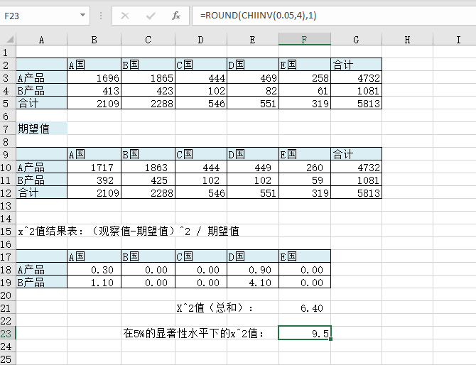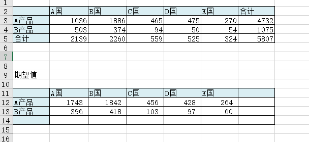 A国A产品的销售期望值=A国的合计*全部A产品的比值(A产品合计/总合计)=2139*(4732/5807)=1743