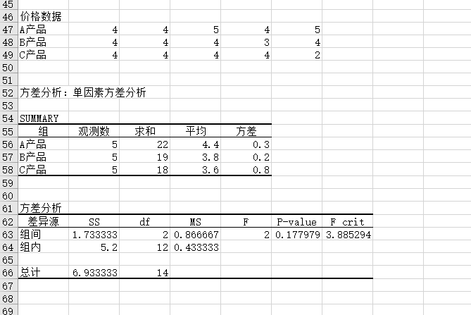 通过数据计算出的F值为2,而显著水平为5%时的F值为3.89,因而不能拒绝假设。即各组数据的平均值之间不存在差异,也就是根据样本不能断定3个产品在价格方面的评价的平均值之间存在显著性差异。
