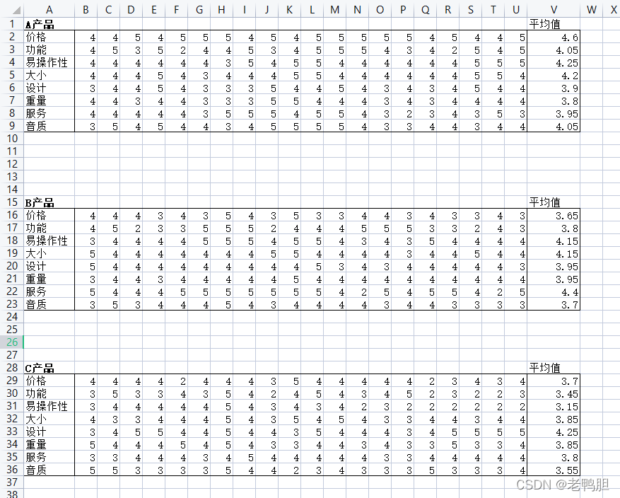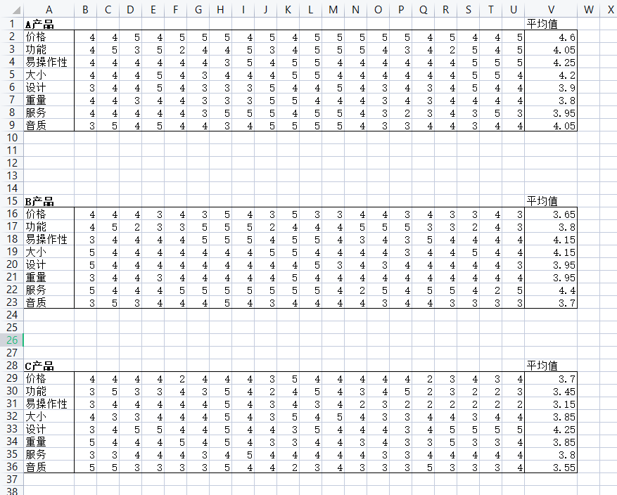 下表为某公司针对本公司生产的A产品及其他公司生产的B产品、c产品就价格、功能、易操作性、大小、设计、重量、服务、音质共8各方面向20人进行问卷调查。