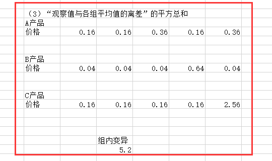 总体变异,即各组数据的离散程度恰好可以分解成“组间离散程度”(这里指产品平均值的离散程度)和“组内离散程度”(这里指被调查者对于同一产品的回答的离散程度) 这两个因素。