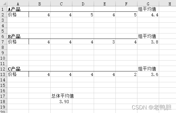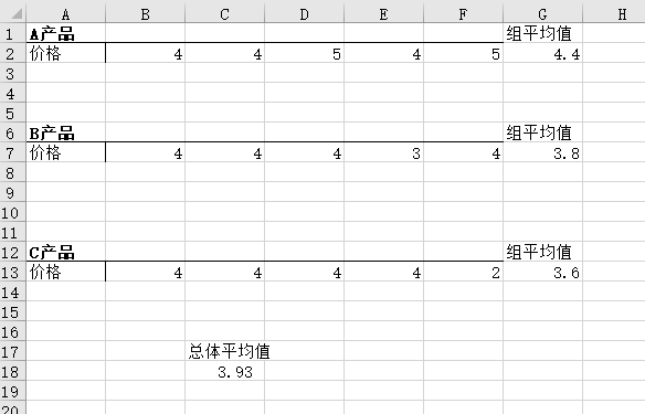 可以看到每种产品的组平均值和总体平均值,总体平均值是将各个产品的组平均值求和除以产品个数。