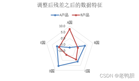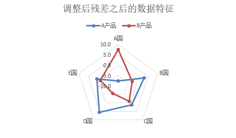 下图为用excel的雷达图反映了A、B产品在不同国家的调整后残差。这样,哪个产品在哪个国家销售情况较好(较差)就一目了然了。