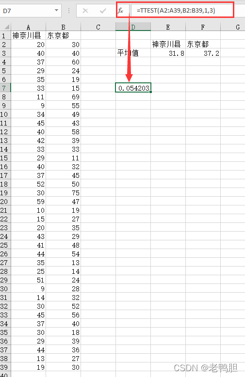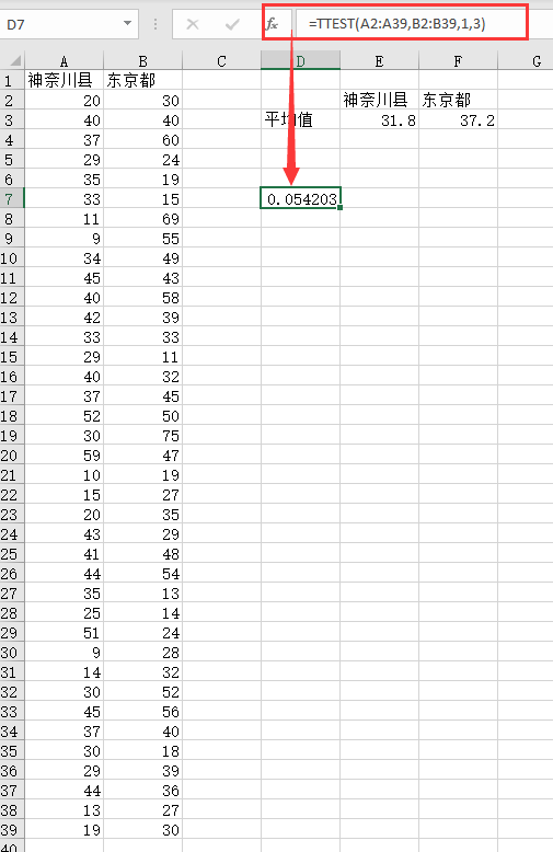 这时候就需要对“从样本得出的平均值31.8,37.2能否由此推测两组总体的平均值存在统计学意义上的差异”进行检验了。这称为t检验。