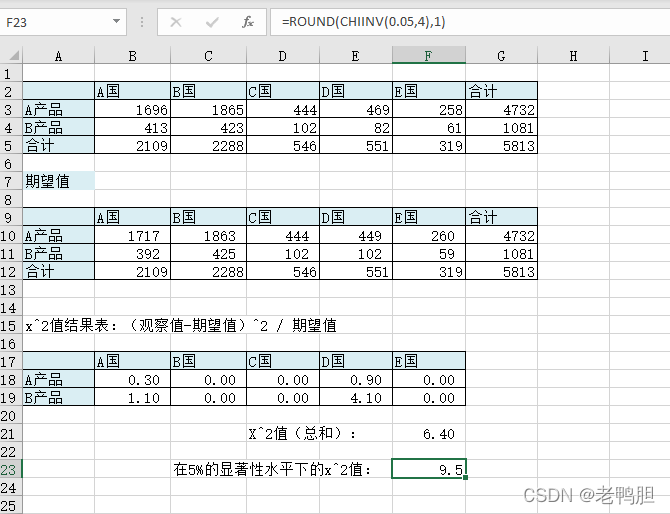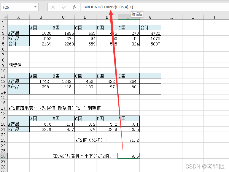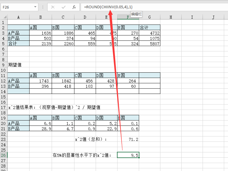 由上图可知,通过计算得出的x^2值为71.2,5%显著水平下的x^2值(chiinv函数计算)为9.5,因此可拒绝假设“A、B产品在不同国家的销售情况不存在差异”,换句话说就是“观察值与期望值的离散程度超越了可以用偶然性来解释的范围,A、B产品在不同国家的销售情况存在统计学意义上的差异”。