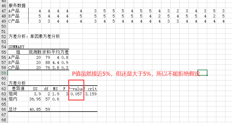 运用excel中的分析工具进行方差分析后,要得出结论只需看P值,若其小于显著性水平5%则拒绝假设,若大于5%则不能拒绝假设。