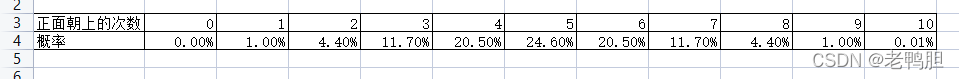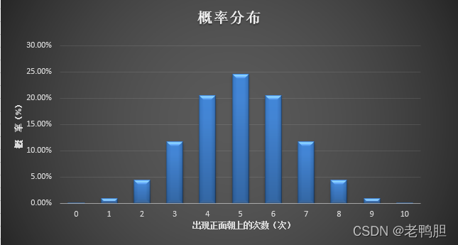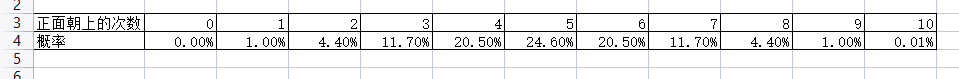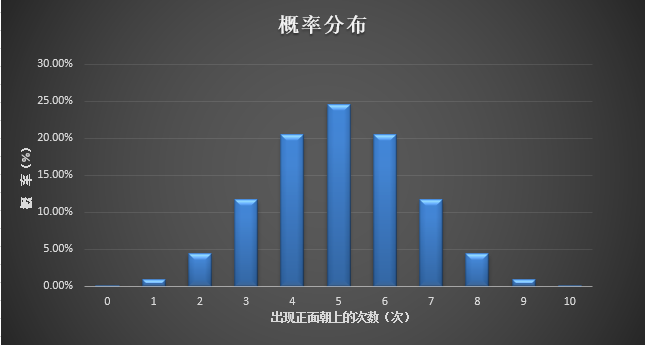 步骤二:利用二项分布的概率原理计算出投掷10次硬币出现的正面或反面朝上的概率,并用图表表示以上的结果。