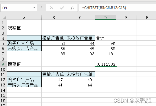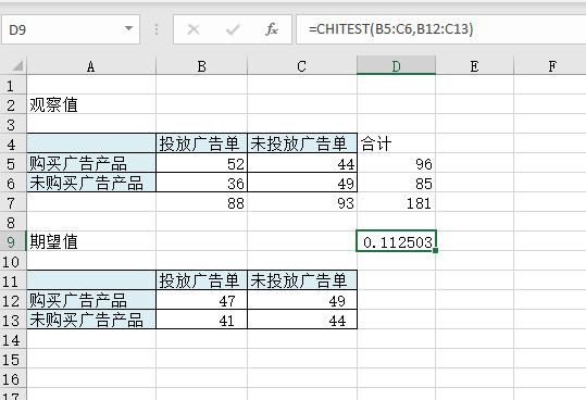 结果11%大于5%,也就是不能拒绝假设,得出投放广告单与产品销售之间是独立的,也就是投放广告单与产品的销售并没有关系。