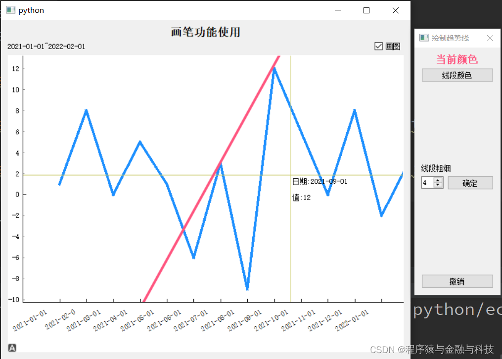 if __name__ == '__main__': temp_map = {} temp_map['xTick'] = [(0, '2021-01-01'), (1, '2021-02-0'), (2, '2021-03-01'), (3, '2021-04-01'), (4, '2021-05-01'), (5, '2021-06-01'), (6, '2021-07-01'), (7, '2021-08-01'), (8, '2021-09-01'), (9, '2021-10-01'), (10, '2021-11-01'), (11, '2021-12-01'), (12, '2022-01-01'), (13, '2022-02-01'), ] temp_map['xTick00'] = temp_map['xTick'] temp_map['x'] = [0, 1, 2, 3, 4, 5, 6, 7, 8, 9, 10, 11, 12, 13] temp_map['y'] = [1, 8, 0, 5, 1, -6, 3, -9, 12, 6, 0, 8, -2, 3] temp_map['title_str'] = '画笔功能使用' temp_map['whole_data'] = [{'日期': '2021-01-01', '值': 1}, {'日期': '2021-02-01', '值': 8}, {'日期': '2021-03-01', '值': 0}, {'日期': '2021-04-01', '值': 5}, {'日期': '2021-05-01', '值': 1}, {'日期': '2021-06-01', '值': -6}, {'日期': '2021-07-01', '值': 3}, {'日期': '2021-08-01', '值': -9}, {'日期': '2021-09-01', '值': 12}, {'日期': '2021-10-01', '值': 6}, {'日期': '2021-11-01', '值': 0}, {'日期': '2021-12-01', '值': 8}, {'日期': '2022-01-01', '值': -2}, {'日期': '2022-02-01', '值': 3}] QtCore.QCoreApplication.setAttribute(QtCore.Qt.HighDpiScaleFactorRoundingPolicy.PassThrough) app = QtWidgets.QApplication(sys.argv) temp_widget = PyQtGraphLineWidget() temp_widget.set_data(temp_map) temp_widget.show() sys.exit(app.exec_()) pass