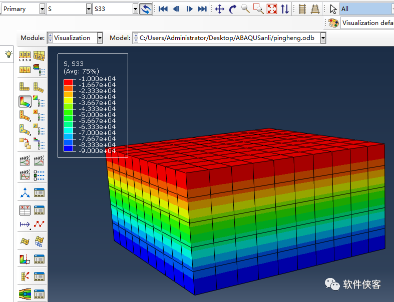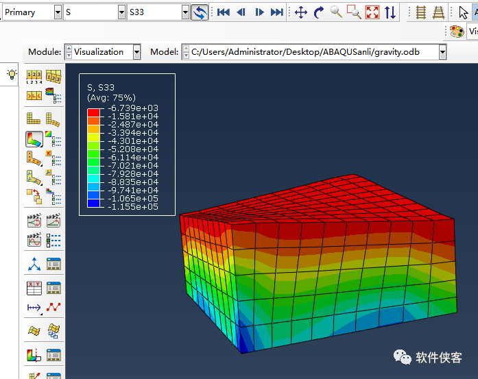 计算完成后,点击Results查看结果,S33为Z轴向的应力,如下所示: