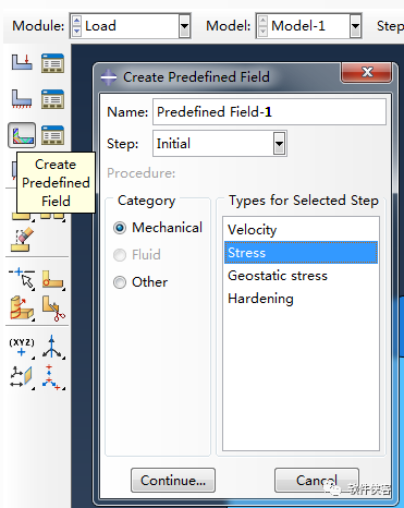 在ABAQUS---Model---Edit keyword---Model-1(这就是你的Model名字)---在材料属性后面加上: *initial conditions,type=stress,input=stress-in.csv完成。