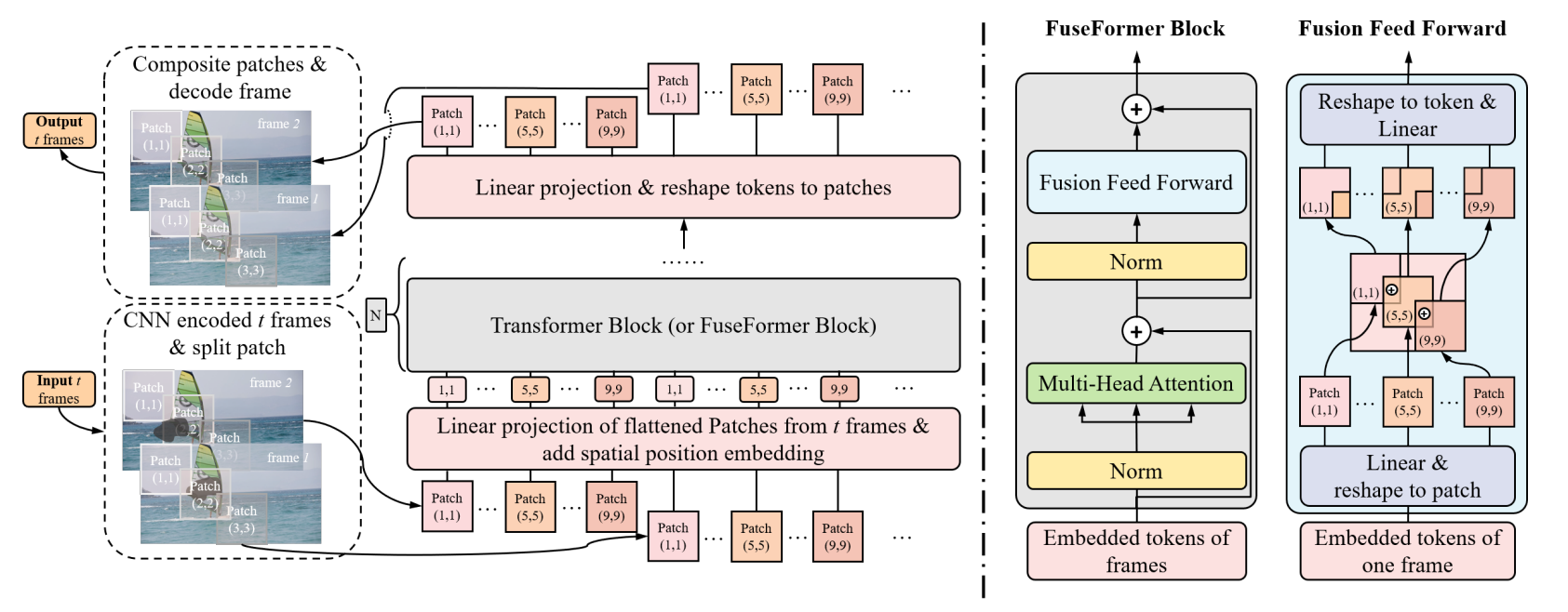 FuseFormer是在transformer block的前向传播过程中做了改进,原来我们将图像且分为patch的方式是将一个图像均匀的分为多少个patch,patch和patch之间并没有重叠,而FuseFormer将patch之间做到了融合,即patch之间有重叠的部分(通过fold和unfold方式实现),原文中说的是:overlapped区域聚合了很多tokens的信息,这对于平滑的边界以及增加感受野很有用
