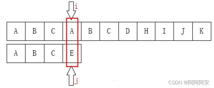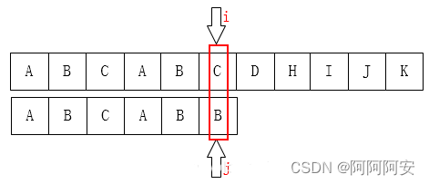 - 匹配失败时:失败位置之前的主串(i前)和子串(j前)部分一定都是匹配的。且对于子串来说,失败位置之前(j前)的任一部分属于子串(模式串)的这段子串(子子串)的后缀