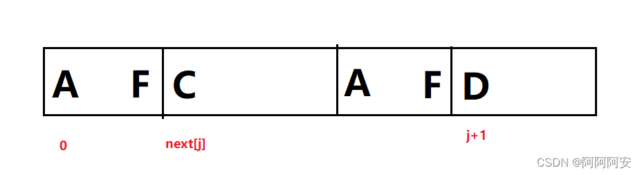 - 若 S[ j+1 ] != S[ next[j] ] : 则说明该结尾处的相同前后缀应该比 j 处的更短一些,也就是我们要找一个更短的前缀和 j+1 处的后缀进行相等匹配。但是由 j 处的匹配可知 A~F 段的前后缀是相同的,因此这就等价于我们要在前缀 A~F 段中即 0~next[j]-1 中寻找一个尽可能大的相同前后缀。而之前的前后缀我们都已经求出了,于是比较就变成了 k = next[next[j] - 1] & S[j+1] == S[k] ?