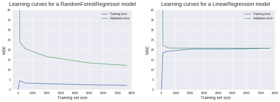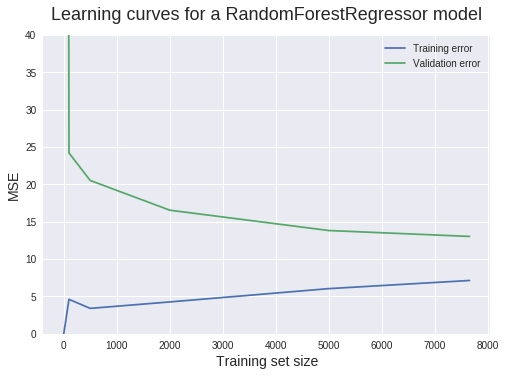 - plt.ylim(0,40) Plotting the two learning curves from sklearn.ensemble import RandomForestRegressor